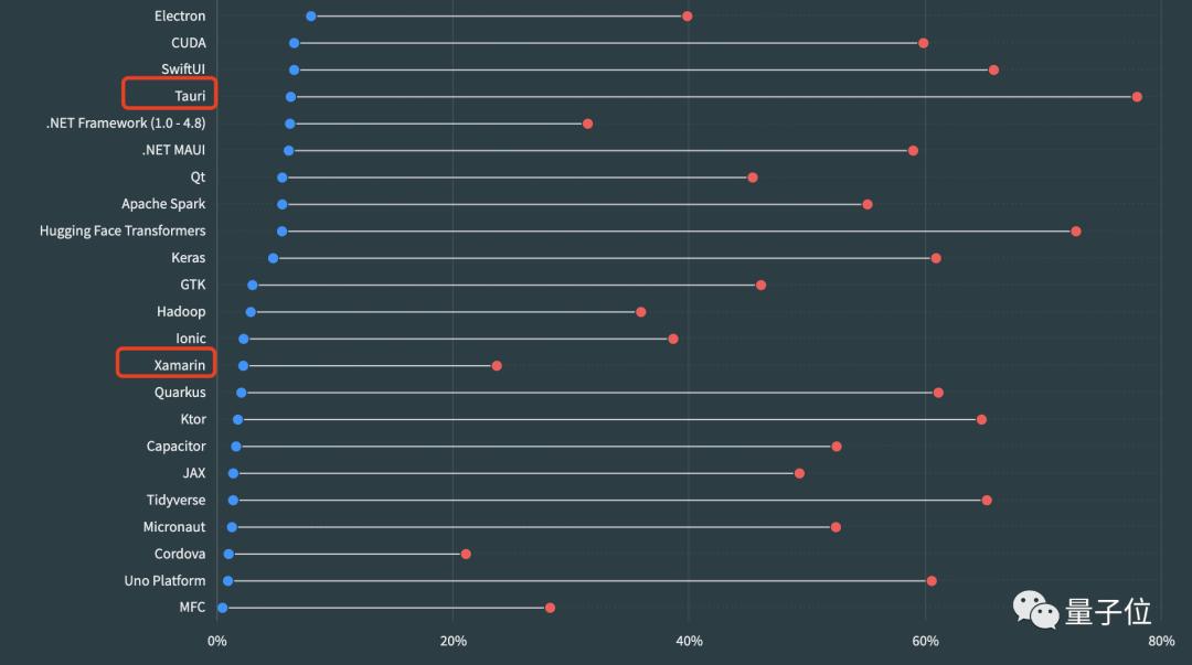 同样,这类框架中最受欢迎的是用于构建跨平台桌面应用程序的新兴框架Tauri,最不受欢迎的是Xamarin,它诞生于2011年。
