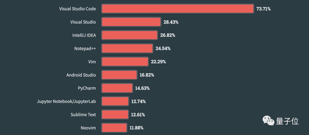 今年的IDE就不单拿出来了说了,变化不大,Visual Studio Code仍然第一,只不过使用率进一步上升,从去年的75%提高到81%。