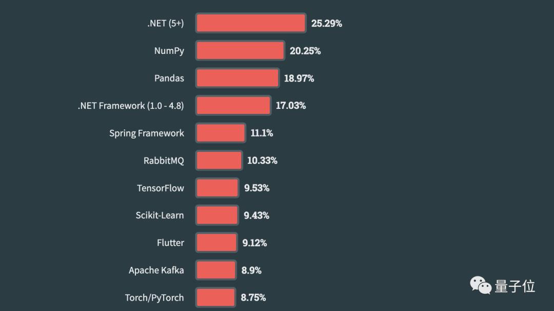 其他框架方面,最流行的则是.NET、NumPy和Pandas,其中后两者都是利用Python做数据分析的“得力板斧”。