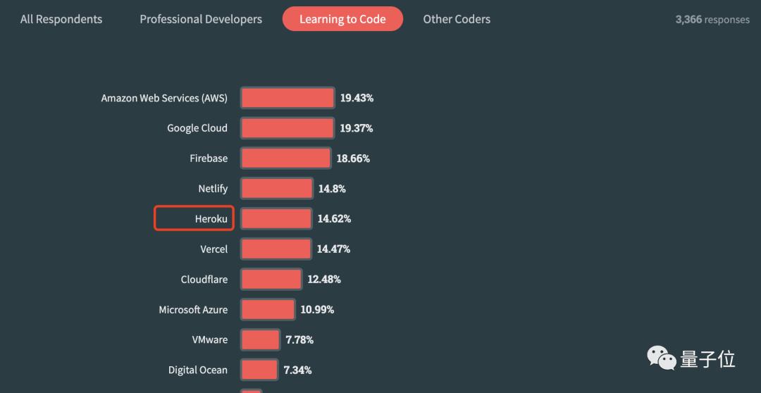 值得一提的是,Heroku是去年学习代码的人(非专业开发者)使用最多的云平台,但今年它下降到了第五位。