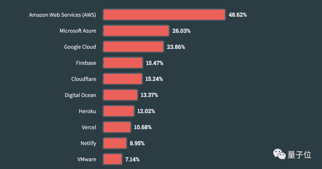 第一还是AWS,且赢得非常干脆——被使用次数大约是第二名Azure、第三名谷歌的两倍。