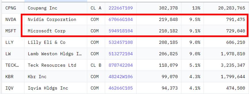 (如上图)截至今年3月末,电子商务平台Coupang(酷澎)、英伟达、微软位列前三大重仓股,市场分别为3.02亿美元、2.2亿美元和2.1亿美元,占到总持仓规模的三分之一。