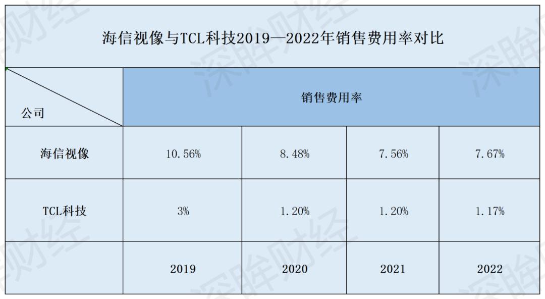一直以来,海信的销售费用都保持高位。其中2019—2022年海信视像的销售费用分别是36.05亿元、33.33亿元、35.36亿元、35.04亿元,占据全年营收的10.56%、8.48%、7.56%、7.66%。同期,TCL2019-2022年销售占比为3%、1.2%、1.2%、1.17%。