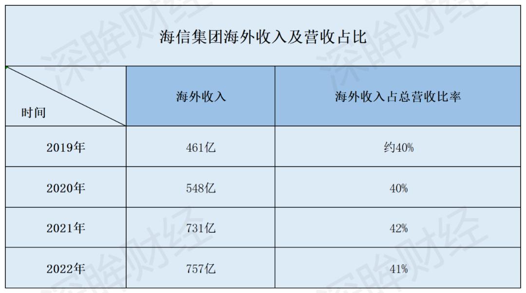 在2022年,海信海外收入757亿元,占全年总营收41%,同比2021年降了1%。