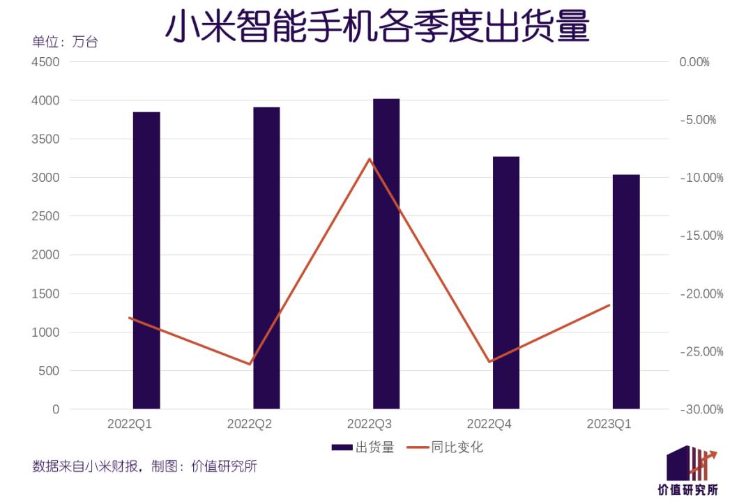 作为小米的基本盘,手机业务的重要地位不言而喻。单看最近几个季度,小米手机在国内、海外市场的表现相差不大,出货量随大盘的萎缩而震荡下滑。