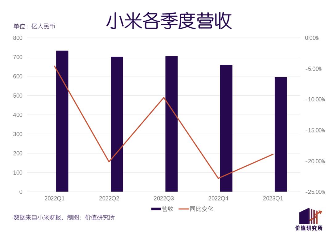今年一季度,小米总营收为595亿元,和市场预期基本一致、跌幅也较上一季度有所收窄,但很难凭此断定小米已经重回正轨。毕竟过去几个季度,小米的起伏一直很大:自去年一季度以来小米营收一直处于负增长状况,同比增速分别录得-4.6%、-20.1%、-9.7%、-22.8%和-18.9%。