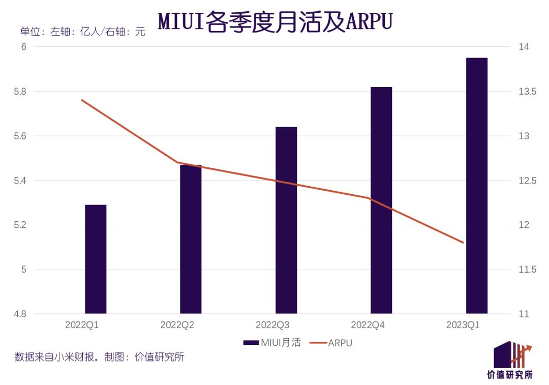 不过小米并非高枕无忧,流量焦虑没有放过任何人。 数据显示,截至今年一季度末MIUI 月活用户为5.95亿,同比增长12.4%,增速自2021年三季度之后一直处于下滑状态。用户的ARPU值则同比下滑12%至11.8元,从2020年三季度开始一直呈负增长态势。