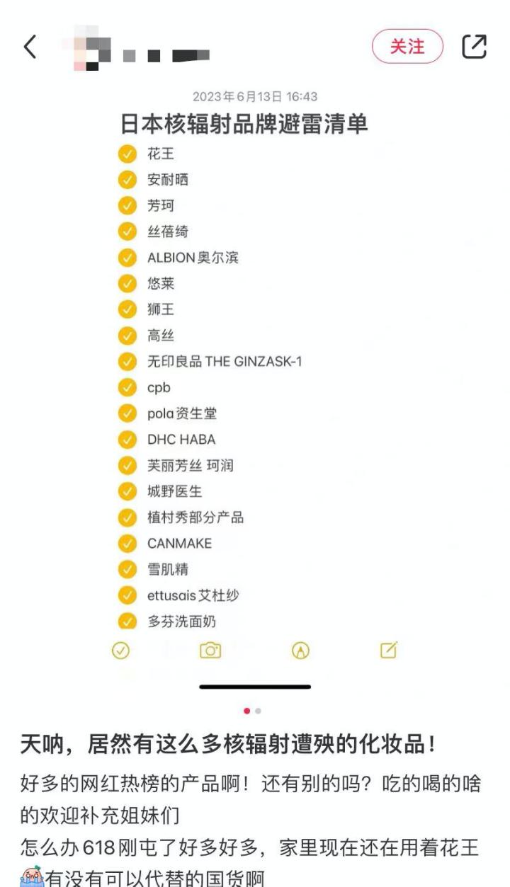 但这一声明没能消除公众担忧,也对其他的日本产护肤和彩妆产品产生连带效应。有网友总结清单称,包括茵芙莎IPSA、城野医生、珂润等品牌都“不建议再用”。
