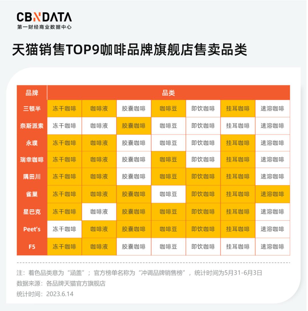 在天猫渠道,品牌之间的价格战也依然在上演。由于天猫和各个品牌暂未披露预售阶段战报,所以我们选取天猫官方发布的5月31日-6月3日冲调品牌销售榜单中,上榜的9个咖啡品牌作为研究对象。