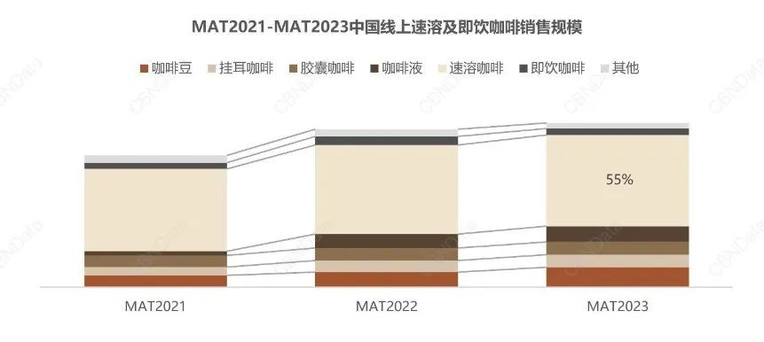 线上咖啡战至今日,虽然各个品牌都已确定了自己的主打品类,但扩展品类以获取更多客群依然必不可少。CBNData统计发现,除了专供胶囊咖啡的奈斯派索和只卖速溶咖啡的F5依然专注于垂类赛道,其余7个品牌已经扩充了3-6个品类。整体来看,冻干咖啡、咖啡液和挂耳咖啡是布局最多的3个品类,平价、方便、门槛低,让这3个品类成了许多新消费品牌进入咖啡赛道淘金的敲门砖。《2023中国城市咖啡发展报告》也显示,2023年速溶咖啡(含咖啡液、咖啡粉等)销售规模占到线上咖啡市场的55%。
