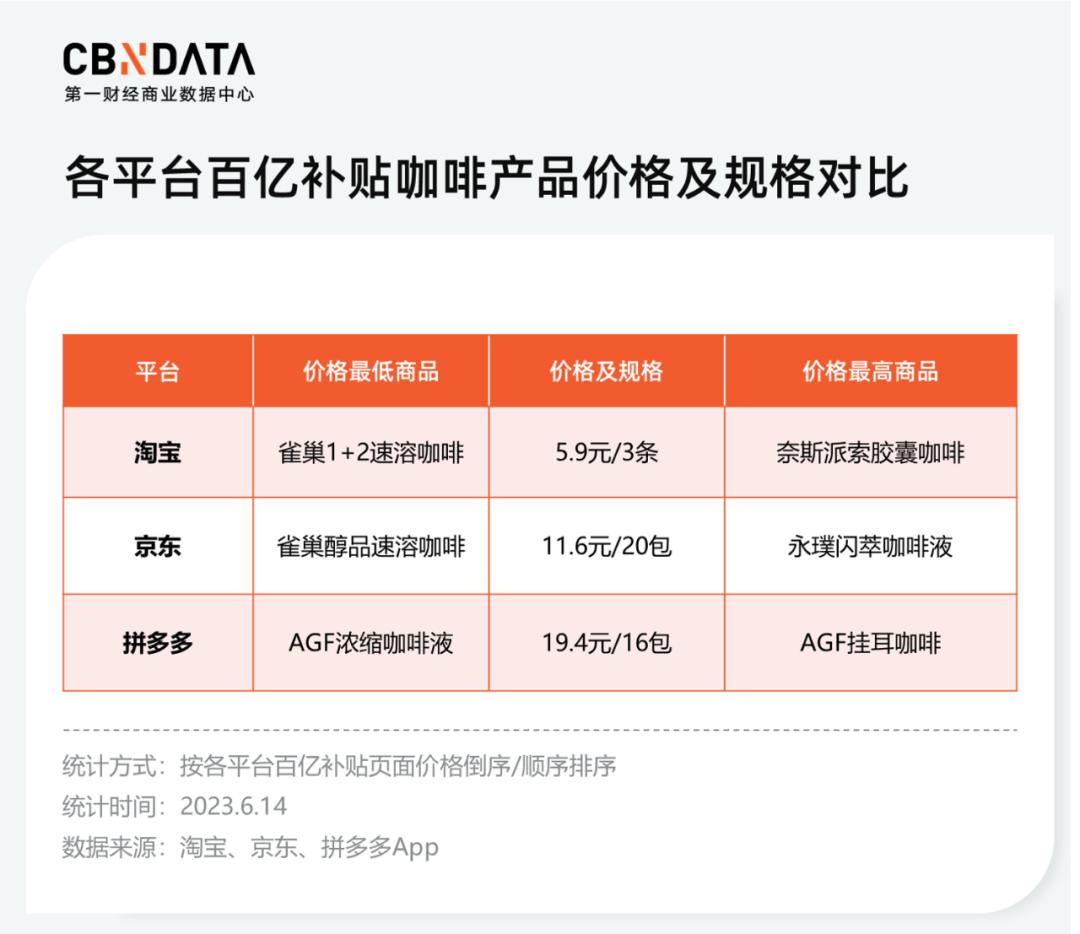 首先是在今年各大品牌都声称“买贵必赔”的百亿补贴版块,不少咖啡品牌也加入其中。CBNData统计了淘宝、京东、拼多多补贴频道的价格最高/最低商品,结果如下: