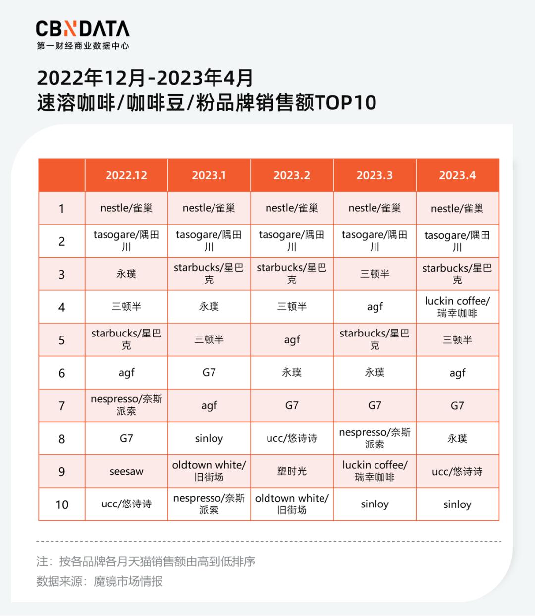 根据魔镜市场情报数据,2022年12月到2022年4月,雀巢都排在咖啡类目销售额TOP1。虽然被调侃“老派”,这家入华超过30年的国际品牌依然保持着一定优势。此外,三顿半、永璞等品牌日常稳定保持TOP10中上游地位,隅田川则保持月度TOP2。