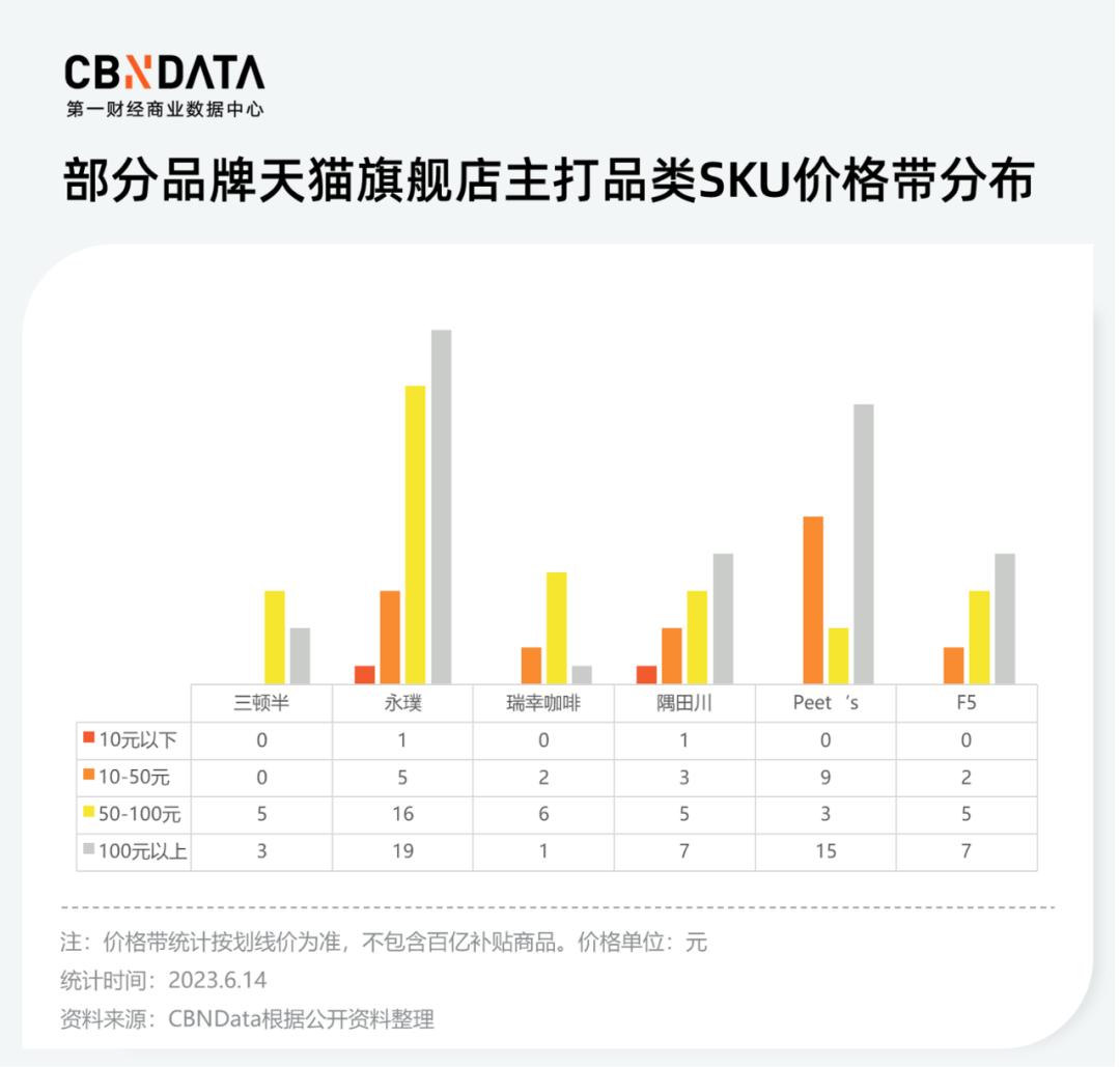 主打冻干咖啡、咖啡液、挂耳咖啡的品牌数量多、厮杀激烈,CBNData也从前述9个品牌中筛出了6个横向对比他们的SKU价格分布情况。10元以下价格带中,只有永璞和隅田川推出了会员和试饮装拉新,10-50元区间只有三顿半未设置SKU。瑞幸咖啡延续了性价比策略,在线上也将冻干咖啡的大部分SKU控价在50-100元之间,100元以上仅有一款60杯的量贩SKU。