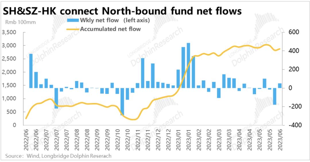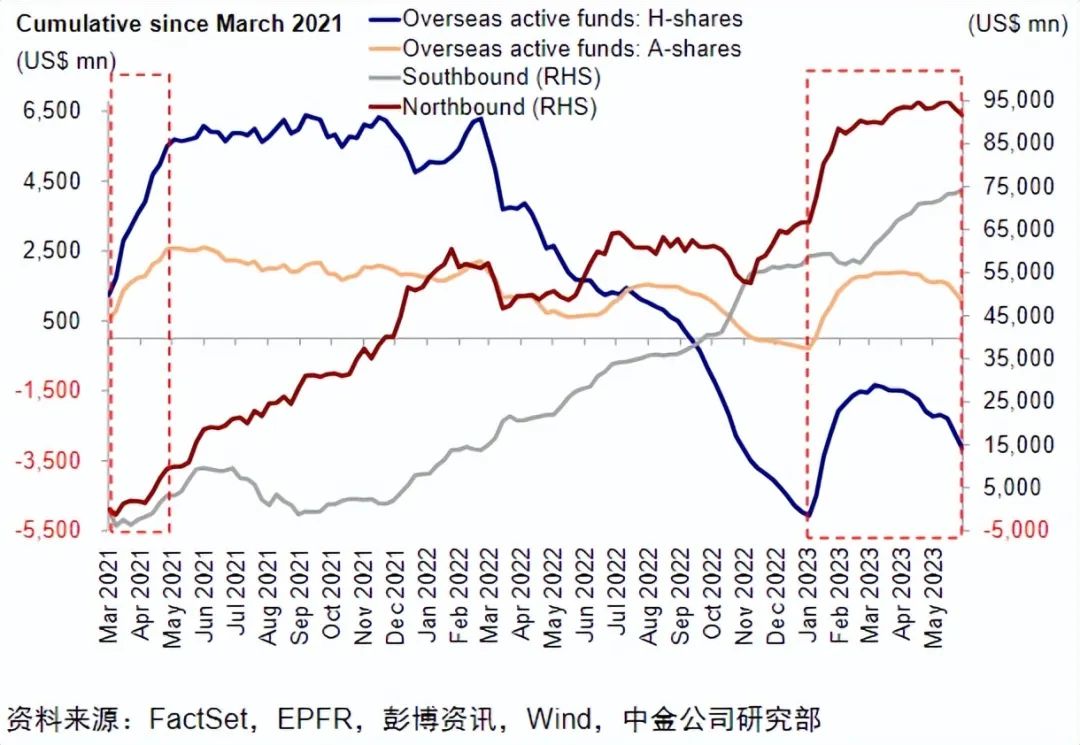 考虑到南北向资金中有部分港资和离岸中资机构,可能会让我们高估外资对国内资产的乐观程度。根据中金统计的海外主动基金的资金流向来看,从3月的高点到5月底,纯海外资金流出A股约100亿美金,流出港股则达150亿美元左右。粗略来看,两A/H两地市场都回吐了外资从22年10月大底后流入资金的一半。