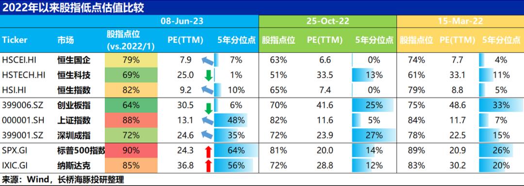 但另一方面,主要由科技、成长股构成的恒生科技和创业板指数,则已回落到了22年初的6-7折。其中恒生科技已接近去年3月的低点, 创业版指 则更是跌破了去年低点。