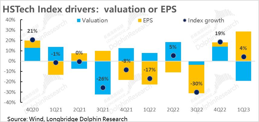 而恒科成分公司一季度股价表现不佳的完全是因为严重的杀估值(拖累指数下行20%),业绩(EPS)却实际是明显增长的。