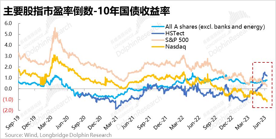 可见由于美国经济尚未出现衰退迹象,且生成式Ai浪潮大幅拉升科技股热度的情况下,美股市场情绪是相当高涨的,似乎并不担心后续业绩进一步恶化的风险。而中国资产,特别是互联网、电新、消费等行业,则对部分公司不俗的一、二季度业绩视而不见,过分注重了国内经济的(暂时)低迷现状。