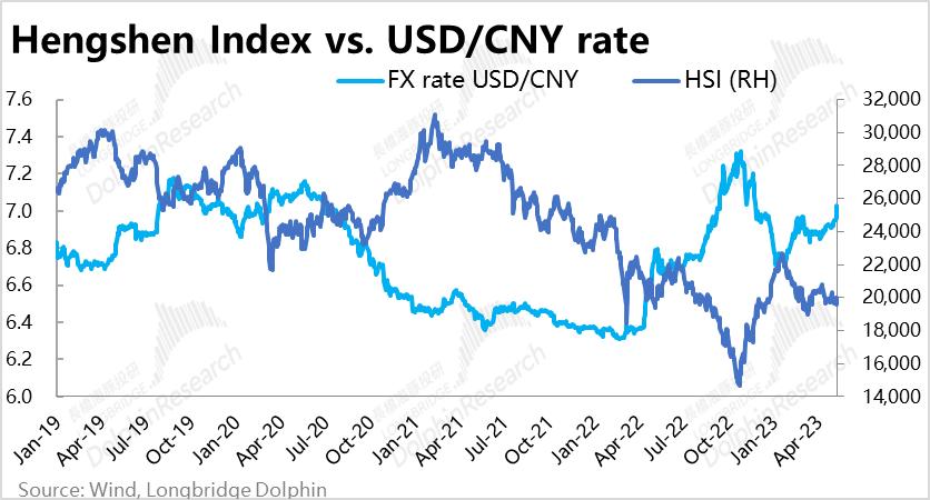 但实际情况并非简单的一一对应,例如恒生指数从2Q21到3Q22期间就和美元汇率是同向走势,在一同下跌。而近几日虽然人民币汇率下行,但港股却连续小幅上涨。关注汇率波动背后的根本原因,才能读懂其和股市间的联系。