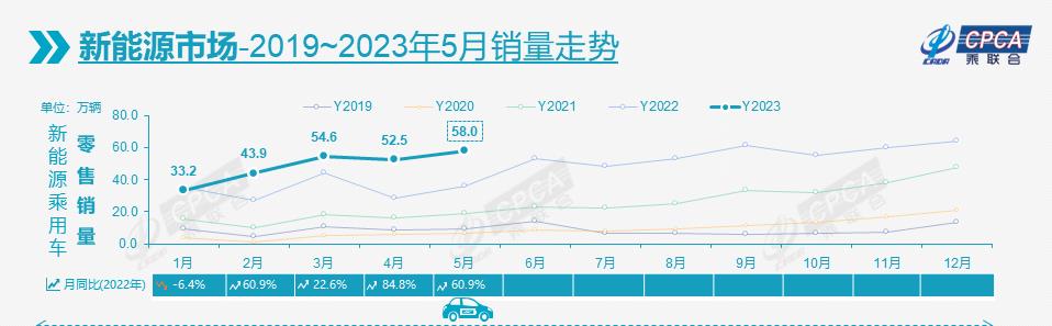 根据乘联会的数据,五月份国内共售出58万辆新能源汽车,已经达到去年旺季的水平。按照4月份的比例来推算,58万辆新能源汽车中大概有40万辆左右是纯电动车。