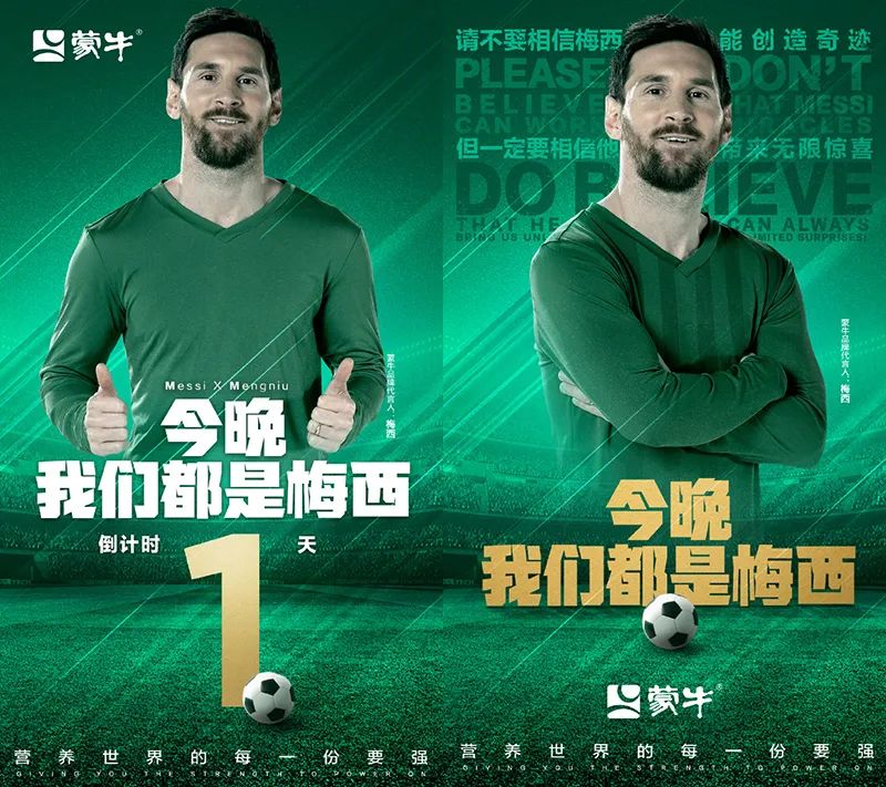 前面几个都是蹭的,来一个货真价实的,当然就是曾经让梅西懵逼的蒙牛。