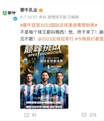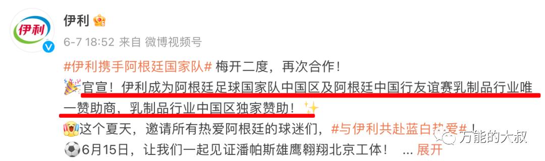 6月7日,和蒙牛同一天,伊利官宣成为阿根廷足球队国家队中国区及阿根廷中国行友谊赛乳制品行业唯一赞助商。