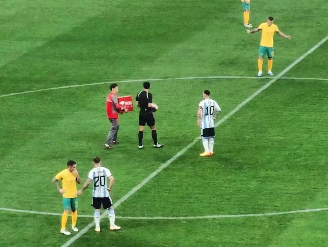 我们回到比赛中。这时,一个京东快递小哥飞奔着出现,打开快递盒,把一颗足球送到了主裁手中,并向梅西挥了挥手。