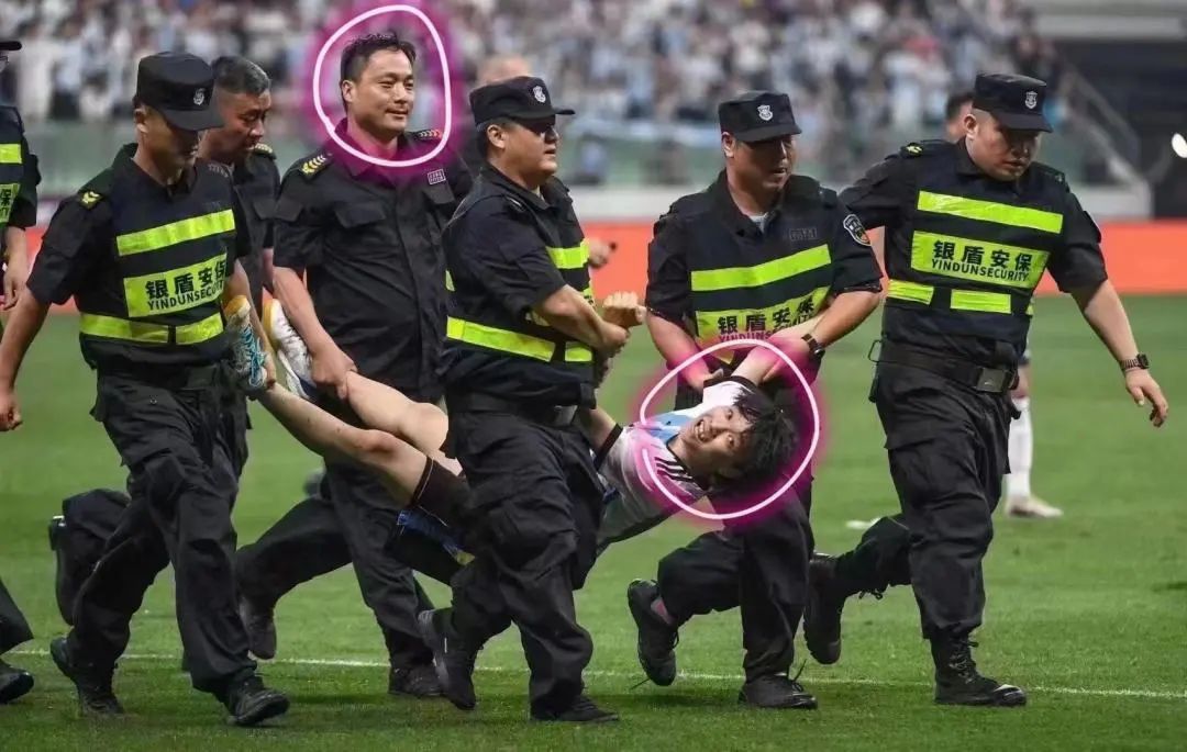 一位不满18岁的中国球迷,冲进球场,与梅西等球员拥抱、击掌,并绕场一圈,最后才被十多名保安抬走。