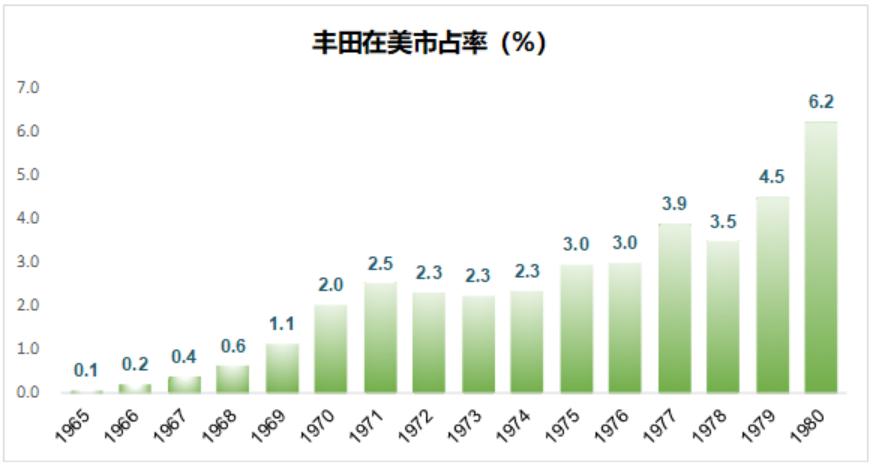 卡罗拉在美国的热销推动了丰田在美国市占率的提升,1965年丰田在美国的市占率只有0.1%,到了1980年市占率就跃升到6.2%。