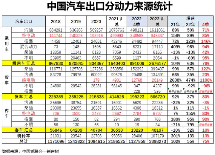 从乘联会的数据看,新能源包括纯电插混,和燃油不分上下,一起贡献了2021、2022两年的出口增量。如果刨掉特斯拉,中国汽车出口还是燃油车扛起了大梁。