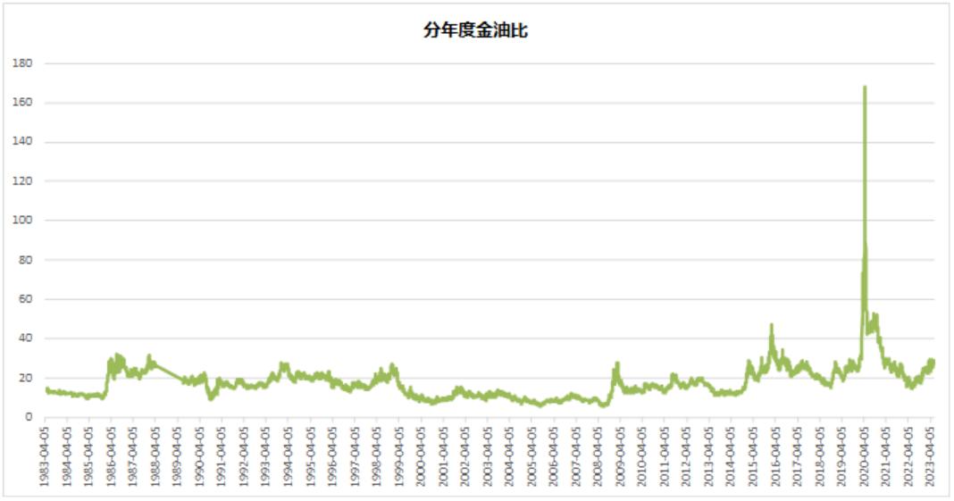 我们看金油比这个指标。金油比,就是伦敦金现与WTI原油结算价的比值,本质上就是原油用作为一般等价物的黄金来计价所得出的结果。因为是黄金与原油直接挂钩,所以排除了中间的计价货币,尤其是美元币值的干扰。