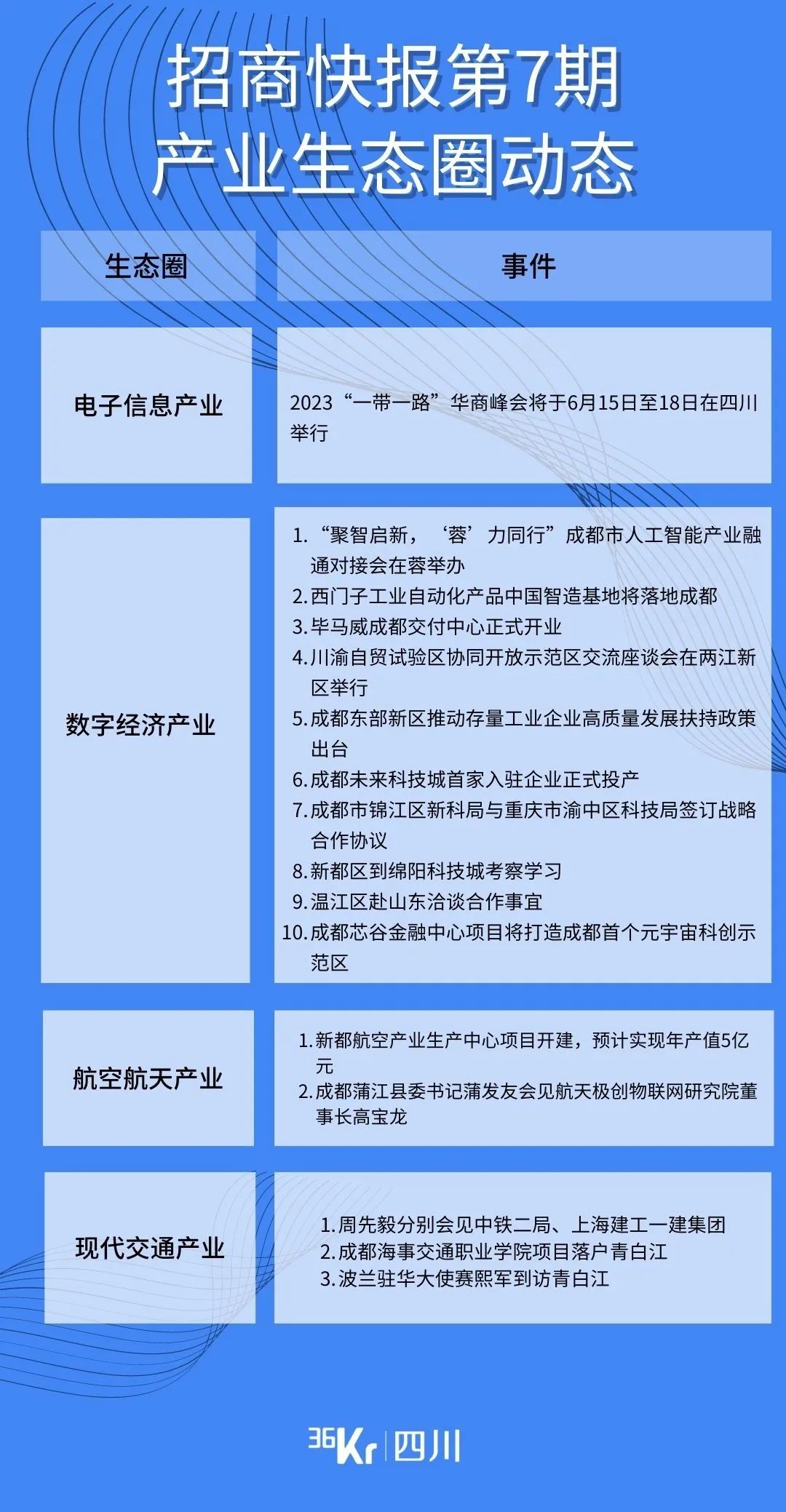 2023年6月15日,36氪四川通过公开渠道,共收录与成都市23个区(市)县相关的招商资讯、政策信息32条。
