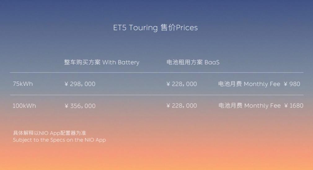 蔚来 ET5 Touring虽然比ET5多了一个Touring,但是“加量不加价”,不论是整车购买的价格还是采用电池租用方案的价格,都和ET5保持一致。