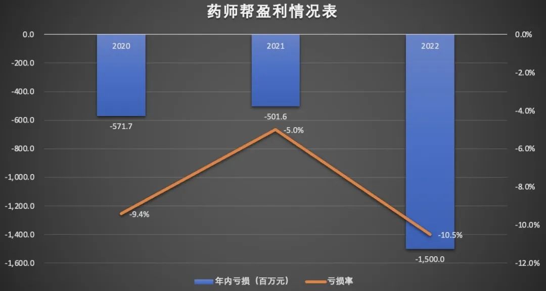 2020年至2022年,药师帮净亏损分别为5.72亿元、5.02亿元和15亿元,亏损程度进一步扩大,三年的净亏损率为9.4%、5.0%和10.5%。