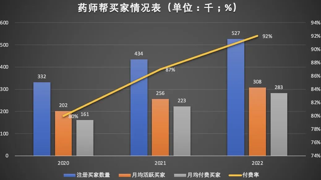 二、从平台买家看,注册买家数量、月均活跃买家、月均付费买家均实现持续增长,付费率从2021年的87%,提升至2022年的92%。