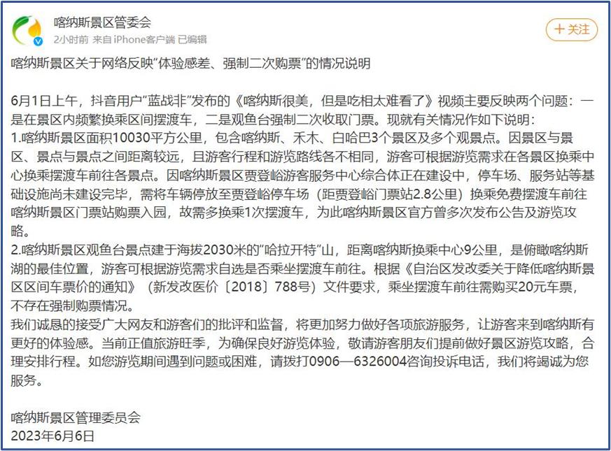 尽管喀纳斯景区管委会迅速发表了详细的情况说明进行回应,但景交车费用过高、体验感差、服务质量跟不上等问题,却依然被广大网友所诟病——