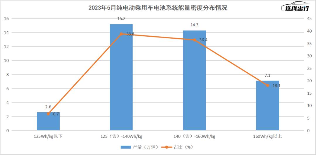 2023年5月纯电动乘用车电池系统能量密度分布情况,数据来源于中国汽车动力电池产业创新联盟,连线出行制图
