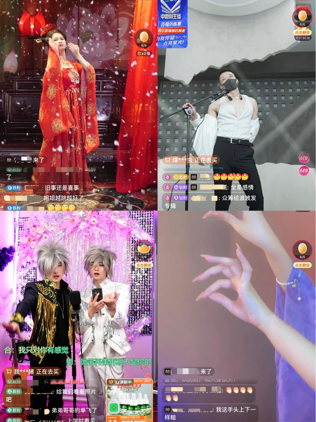 目前流量较好的才艺展示类型有唱歌、舞蹈、模仿秀等。有的直播间以乐队形式出现,吉他、键盘、主唱,有几组人轮番上阵;有的直播间以双胞胎为组合,跳古典舞或模仿男团唱歌;有的直播间是独角戏,跳手指舞、在户外唱歌跳舞等。