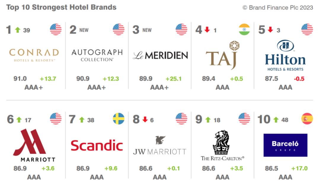 康莱德(希尔顿子品牌)是全球品牌实力榜单的冠军,评级达到AAA+。