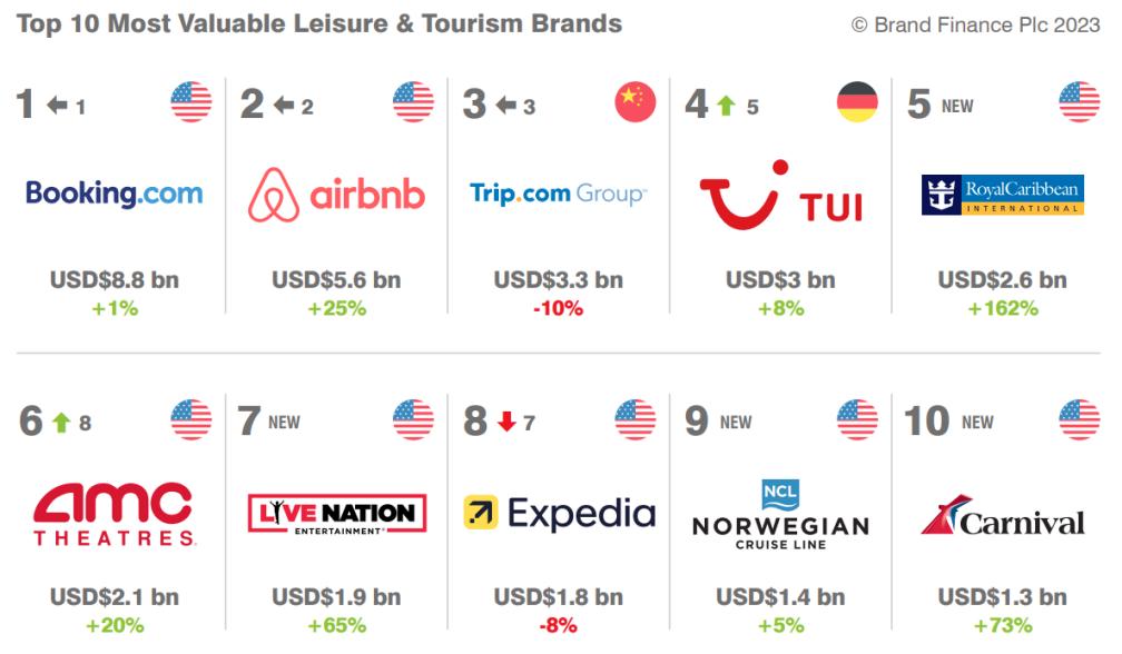 另外,报告还提到,在休闲旅游类品牌价值排名的榜单中,Booking.com(88亿美元)、Airbnb(56亿美元)和携程Trip.com Group(33亿美元)占据前三。Expedia排在第8位,品牌价值为18亿美元。皇家加勒比国际游轮、挪威邮轮和嘉年华邮轮等三大邮轮品牌也进入前十。