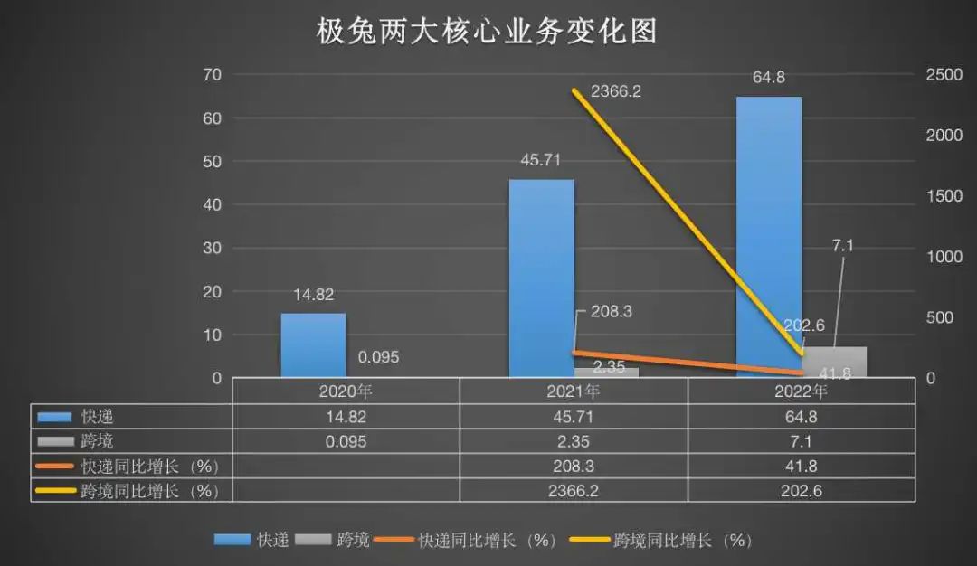 跨境服务中,2021年是跨境电商行业历史上最赚钱年份。极兔同样取得了24倍的增速,从950万美元业绩增长到2亿美元,去年继续增长2倍至7亿美元。