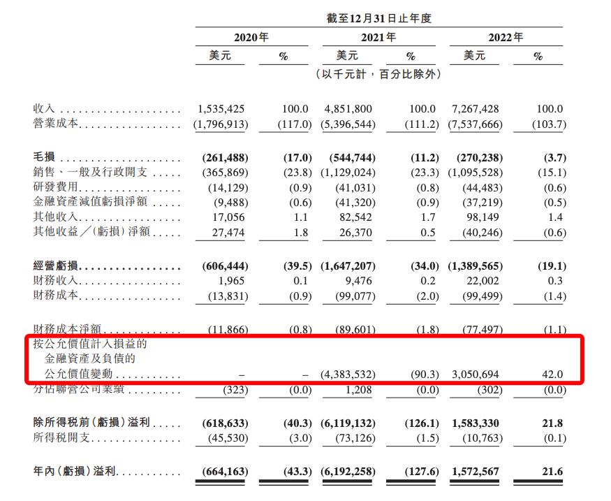 这两项数据的差异就在于,极兔2021年和2022年分别计入了-43.8亿美元、30亿美元的公允价值变动,所以去年净利润看上去就变成盈利了。
