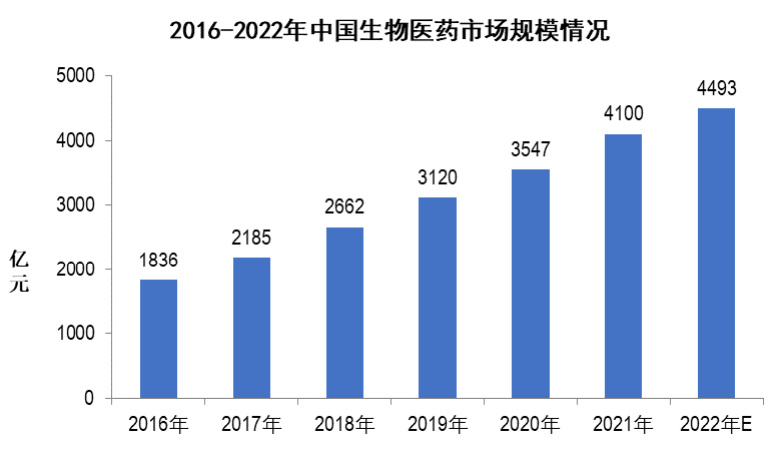 生物医药方面,根据中商情报网统计数据显示,2016-2022年中国生物医药市场规模由1836亿元增长到4493亿元,市场规模呈现不断扩大趋势。