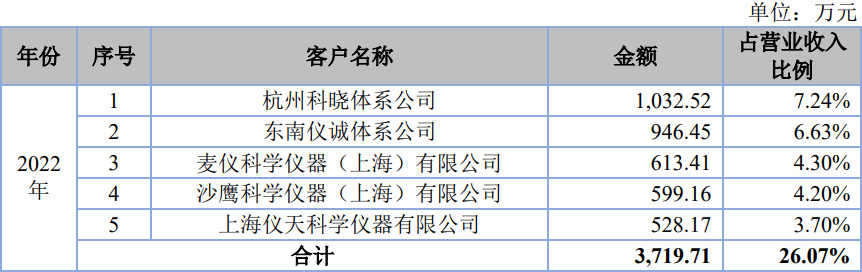 客户方面,2022年公司前五大销售客户分别是杭州科晓体系公司、东南仪诚体系公司、麦仪科学仪器(上海)有限公司、沙鹰科学仪器(上海)有限公司、上海仪天科学仪器有限公司。