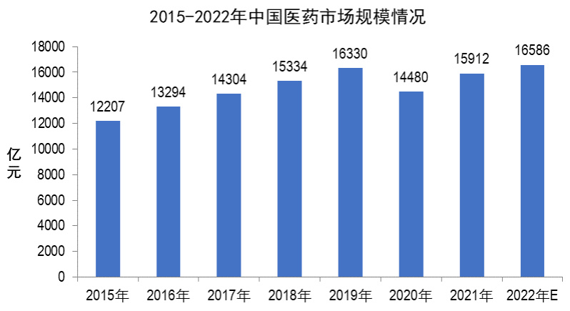 医药行业方面,根据弗若斯特沙利文、中商产业研究院统计数据显示,2015-2022年中国医药市场规模由12207亿元增长到16586亿元。