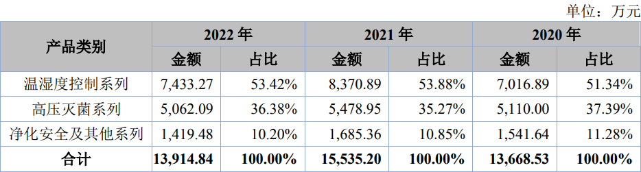 从主营业务收入构成来看,公司主营业务为温湿度控制系列、高压灭菌系列、净化安全及其他系列。2022年温湿度控制系列产品销售额最高,达到7433.27万元,占总销售额53.42%;其次为高压灭菌系列产品,销售额为5062.09万元,占总销售额36.38%。