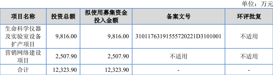 招股书显示,本次公司拟募资1.23亿元,资金将用于生命科学仪器及实验室设备扩产项目、营销网络建设项目等。项目建成达产后,将进一步提高公司关键零部件自产化率,不断推进高端产品的进口替代。
