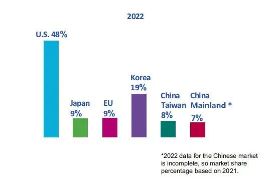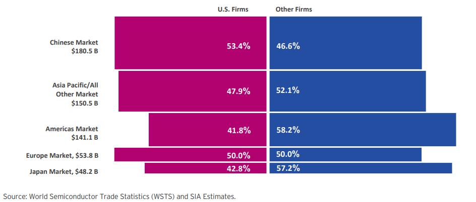 在所有主要的国家和地区半导体市场,总部位于美国的公司也占据了销售市场份额的领先地位。