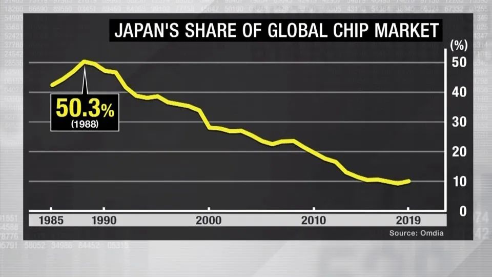 曾经在半导体领域领先全球的日本,在近20年来逐渐失去了优势。日本半导体产品占全球半导体市场的份额从1990年的50%下降到2020年的10%,这一变化也充分说明了上述问题。