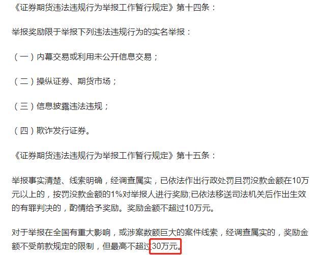 八妹再声明一下,金融圈内,任何性质的公司都没有“市值管理”这项业务的牌照。以后在外面听到这个操作,或者其他坐庄、内幕交易之类的花活,如果有详细的线索证据,可以上报证监会,查实还能领到奖励,最高30万: