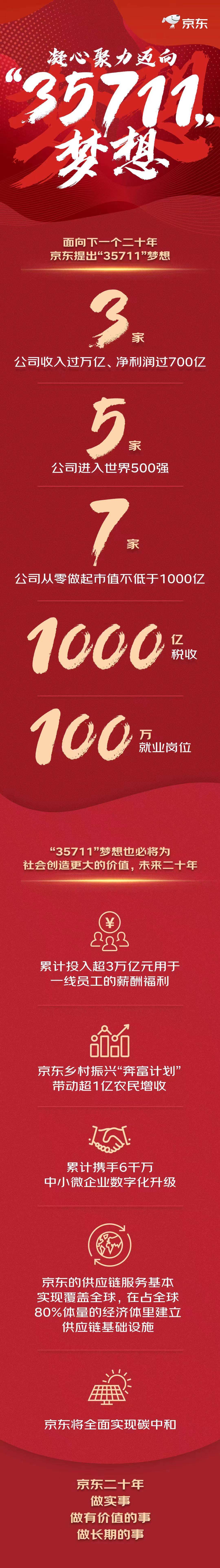 在当天向56万员工发送的《凝心聚力迈向“35711”梦想》全员信中,京东正式提出了面向未来二十年的“35711”梦想:能有3家收入过万亿人民币,净利润过700亿人民币的公司;5家进入世界五百强的公司;7家从零做起市值不低于1000亿人民币的上市公司;能为国家缴纳1000亿人民币税收;提供超过100万就业岗位。